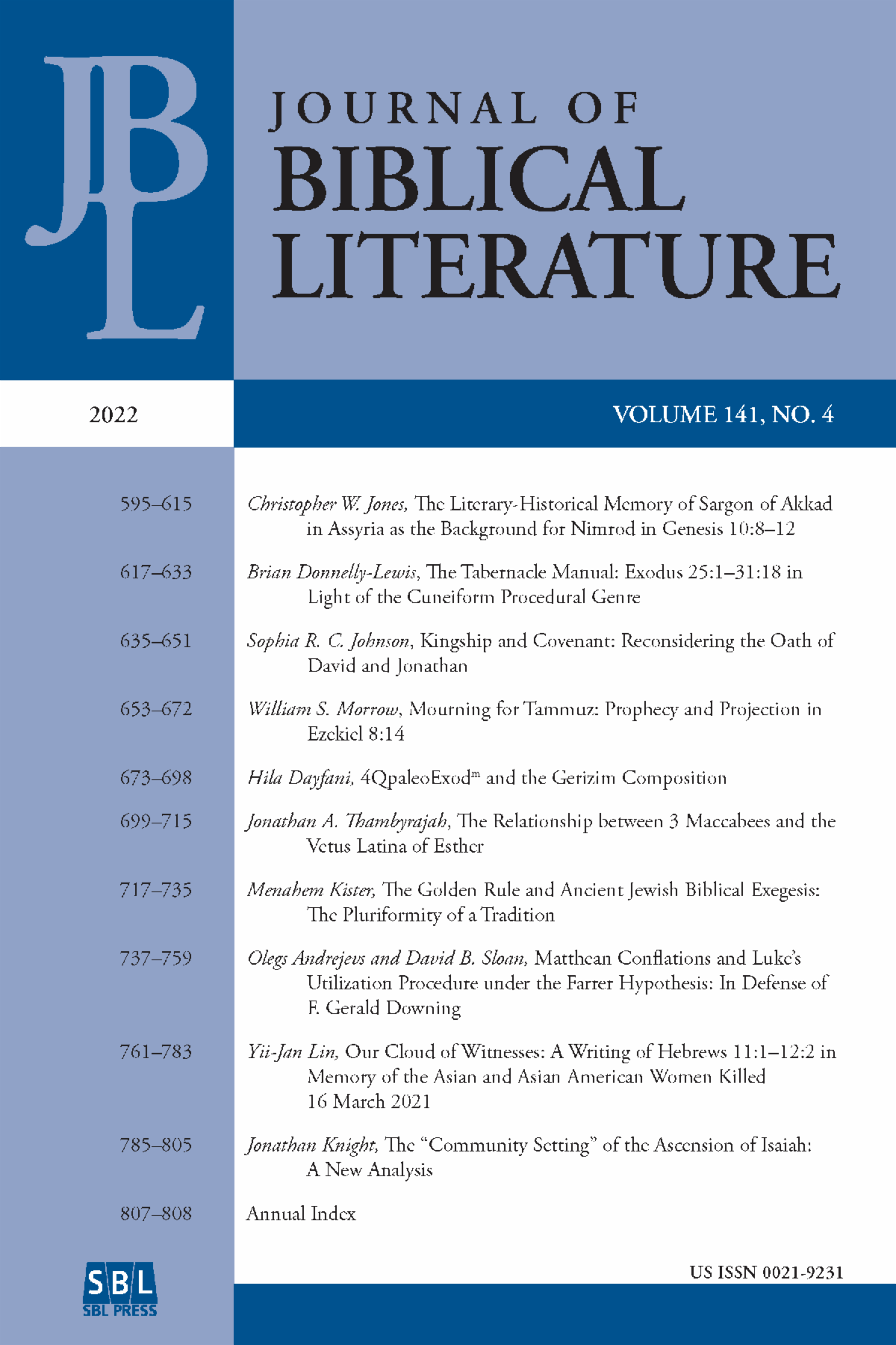 is now available online (free to SBL members). Abstracts are linked below. To read full articles online, log in to the SBL website with your email address and password, then click on the blue "Access all issues online" button at the top of the page. To subscribe to the print edition of JBL or to recommend JBL to your institutional library, click here.